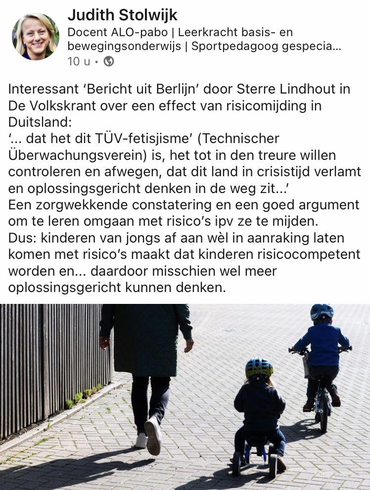 Om pedagogisch professionals bewust te laten worden van de waarde van (fysieke) risico’s voor kinderen is het primair van belang bewust te zijn van de eigen risico-angst. Door dat bewustzijn is het mogelijk om anders naar risico’s van kinderen te (leren) kijken. Kinderen bewust hun fysieke grenzen leren opzoeken en deze grenzen eventueel te verleggen, kan op verschillende manieren. Een van die manieren is het stellen van heel specifieke vragen aan kinderen. Het kind blijft op deze manier eigendom van zijn eigen leren en de professional kan het kind verleiden zijn of haar grens te leren kennen en eventueel te verleggen. Begeleiding bestaat onder andere uit ‘coaching on the job’.